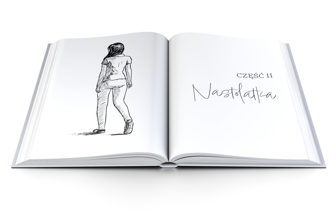 Wnętrze książki zostało zaprojektowane z myślą o komforcie czytania i płynności narracji. Ilustracje, umieszczone na stronach tytułowych kolejnych części, wprowadzają czytelnika w najważniejsze etapy historii. Typografia została starannie dobrana, aby współgrała z ilustracjami i podkreślała emocjonalny przekaz publikacji. Layout jest przejrzysty i elegancki, co sprawia, że treść książki jest jeszcze bardziej angażująca.