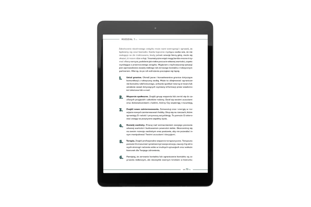 „Toksyczni ludzie niszczą Twoje życie?” to poradnik, który dzięki dopracowanej formie wizualnej i czytelnemu układowi treści może pełnić swoją terapeutyczną funkcję jeszcze skuteczniej. Ebook wygląda nowocześnie, jest wygodny w czytaniu i profesjonalnie przygotowany od pierwszej do ostatniej strony.